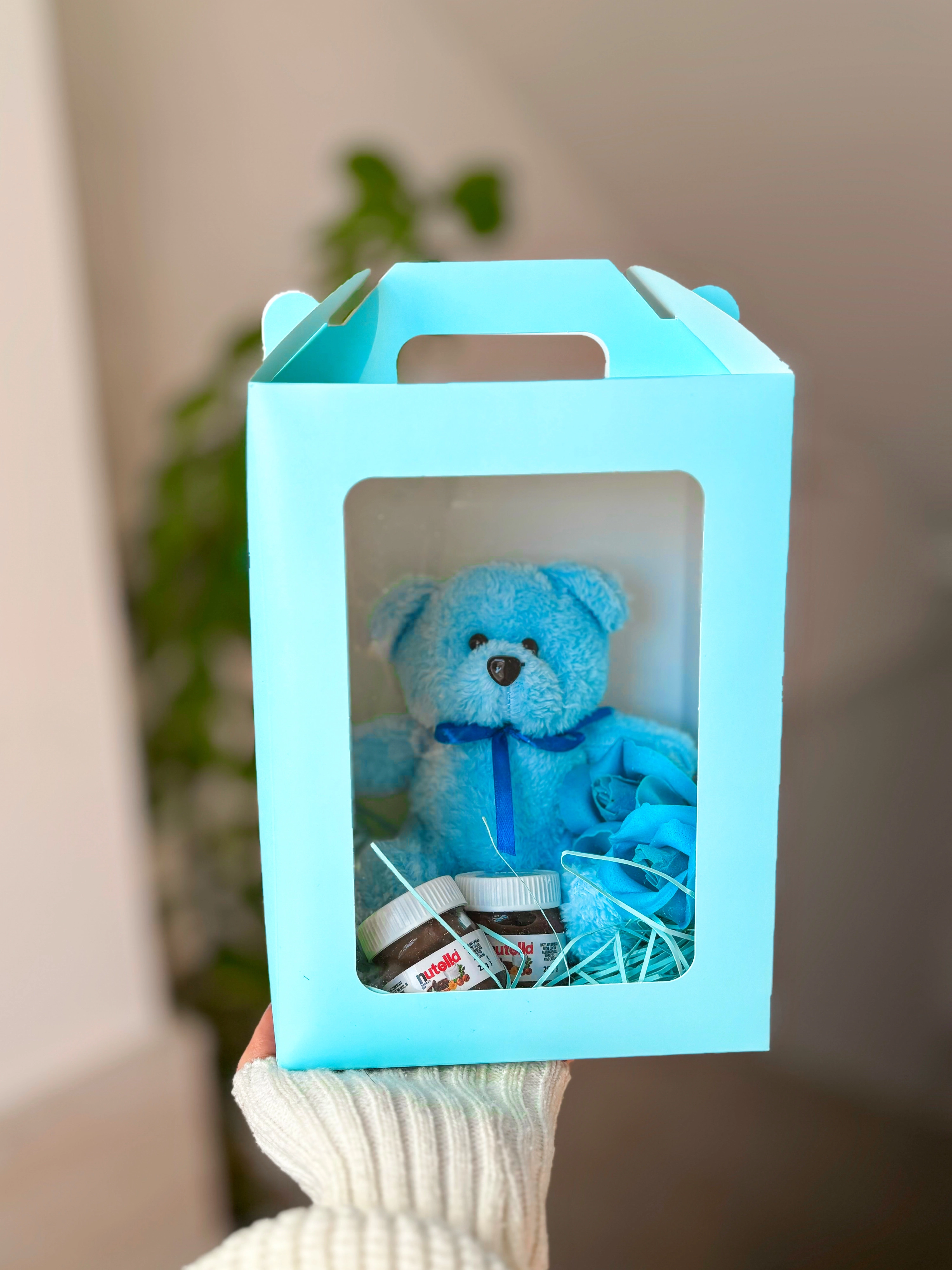 پک دقیقا مشابه تصویر حاوی بگ دستی طلقی ، عروسک خرسی ، دو عدد گل معطر خوشبو ، دو عدد مینی نوتلا « تاریخ دار و تازه » به همراه پوشال