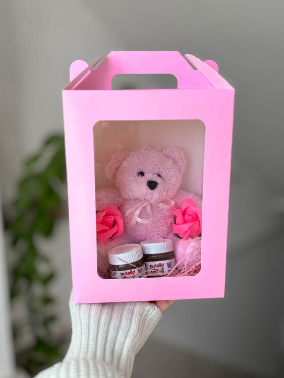پک دقیقا مشابه تصویر حاوی بگ دستی طلقی ، عروسک خرسی ، دو عدد گل معطر خوشبو ، دو عدد مینی نوتلا « تاریخ دار و تازه » به همراه پوشال