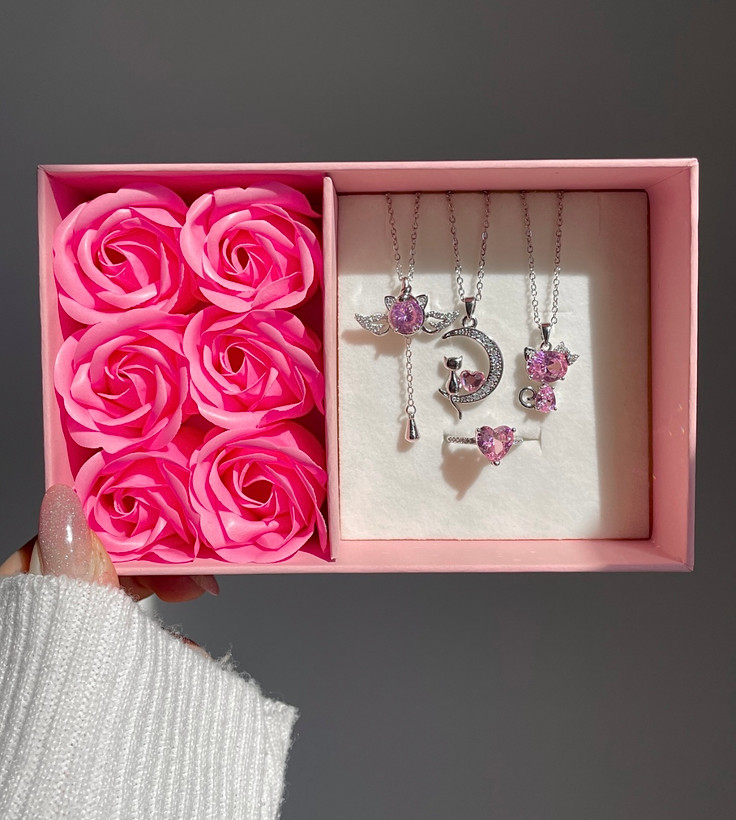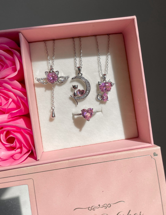 حاوی ۳ عدد گردنبند گربه ، نگین ها مخراح شده ، زنجیر استیل رنگ ثابت ، انگشتر قلب فری سایز و قابل تنظیم ، و باکس گل معطر