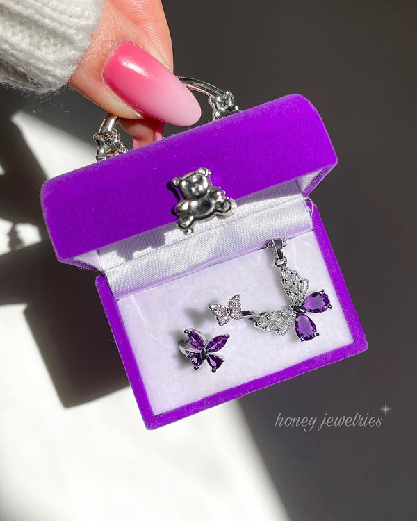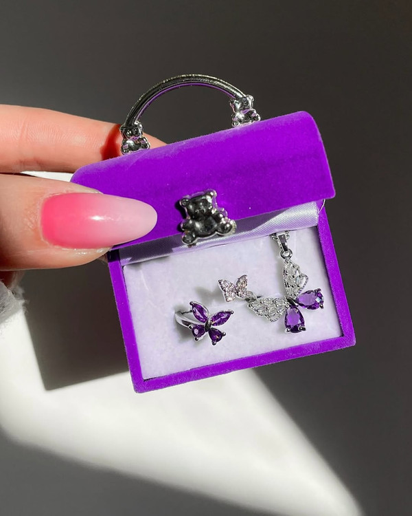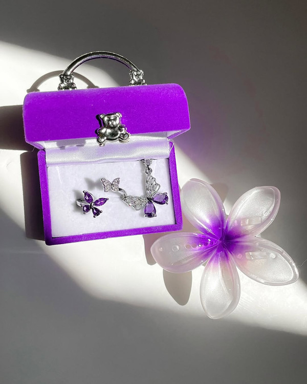 ست پروانه بنفش دلبر ورق بزن پروانه هاش خوده بهارن • زنجیر استیل رنگ ثابت ، پلاک آبکاری شده • نگین ها مخراج شده و ریزش ندارن باکس برای عکاسی هست و همراهش نیست ، باکس های داخل دسته بندی جعبه و تزئینی رو ببینید