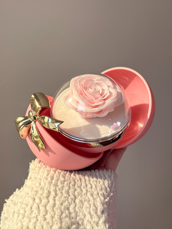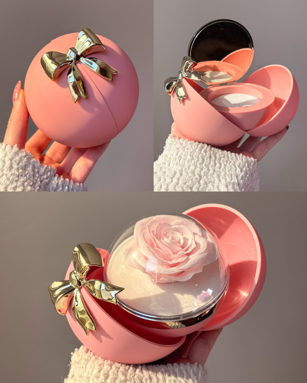 باکس گل جاودان سورپرایزی طرح گوی پاپیونی صورتی