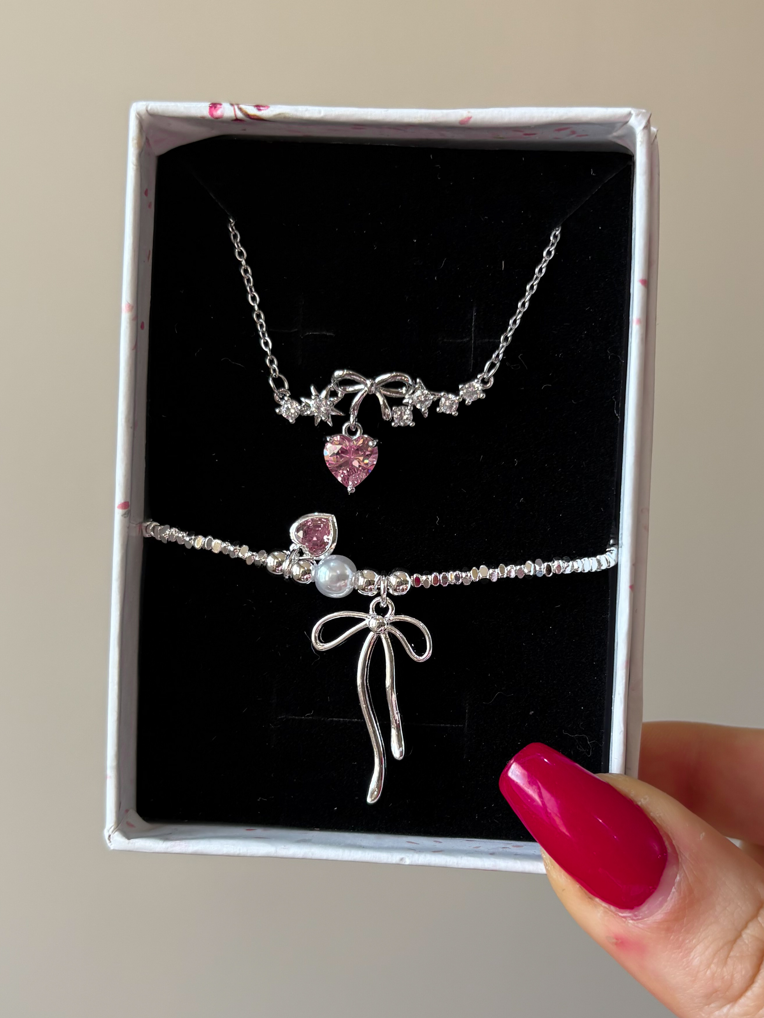 دستبند پاپیون و قلب صورتی آب نقره